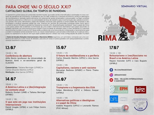 A rede Relações Internacionais e Marxismo (RIMA) convidam para o seminário virtual com o tema “Para onde vai o século XXI? Capitalismo global em tempos de pandemia”, entre os dias 13 e 17 de julho. O capitalismo global passa por… Continue Reading →