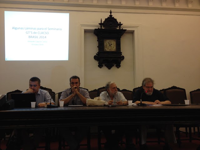 Antônio José Ledo Alves da Cunha (Vice-reitor- UFRJ), Pablo Gentili (Secretário Executivo – CLACSO), Carlos Eduardo Martins (Coordenador GT Integración y Unidad Latinoamericana y Caribeña / CLACSO), Luis Rojas Villagra (Coordenador GT Crisis de la Economía Mundial Capitalista. Determinantes, desafíos y salidas desde una versión crítica y alternativa en América Latina y el Caribe / CLACSO) eMarcelo Dias Carcanholo ( Presidente da SEPLA).