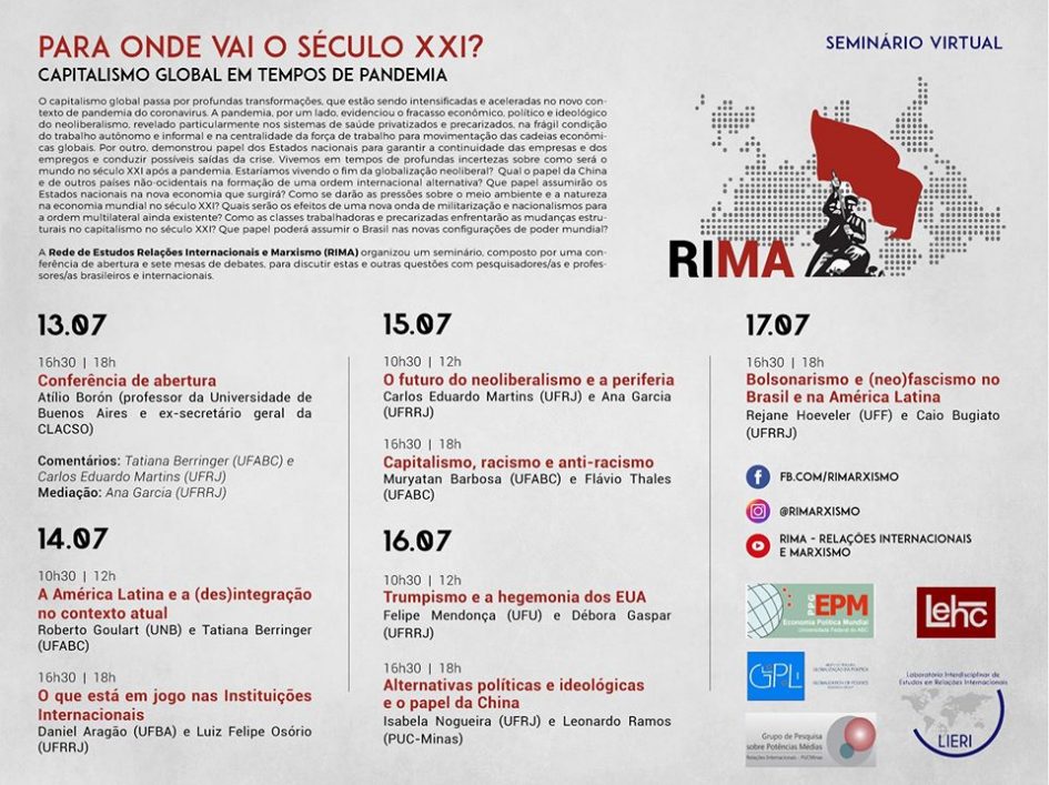 A rede Relações Internacionais e Marxismo (RIMA) convidam para o seminário virtual com o tema “Para onde vai o século XXI? Capitalismo global em tempos de pandemia”, entre os dias 13 e 17 de julho.